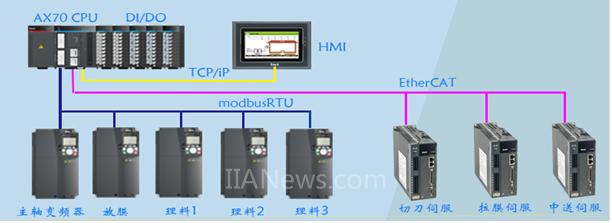 集成运动控制器功能,如电子凸轮、飞剪、追剪、TP补偿等,集成于AX系列控制器中,编程调试方便,同时省去一个运动控制器。在控制器和伺服之间采用EtherCAT通讯,通讯速率高达100Mbps,抗干扰能力强,同时省去很多复杂的接线,提高装机效率。