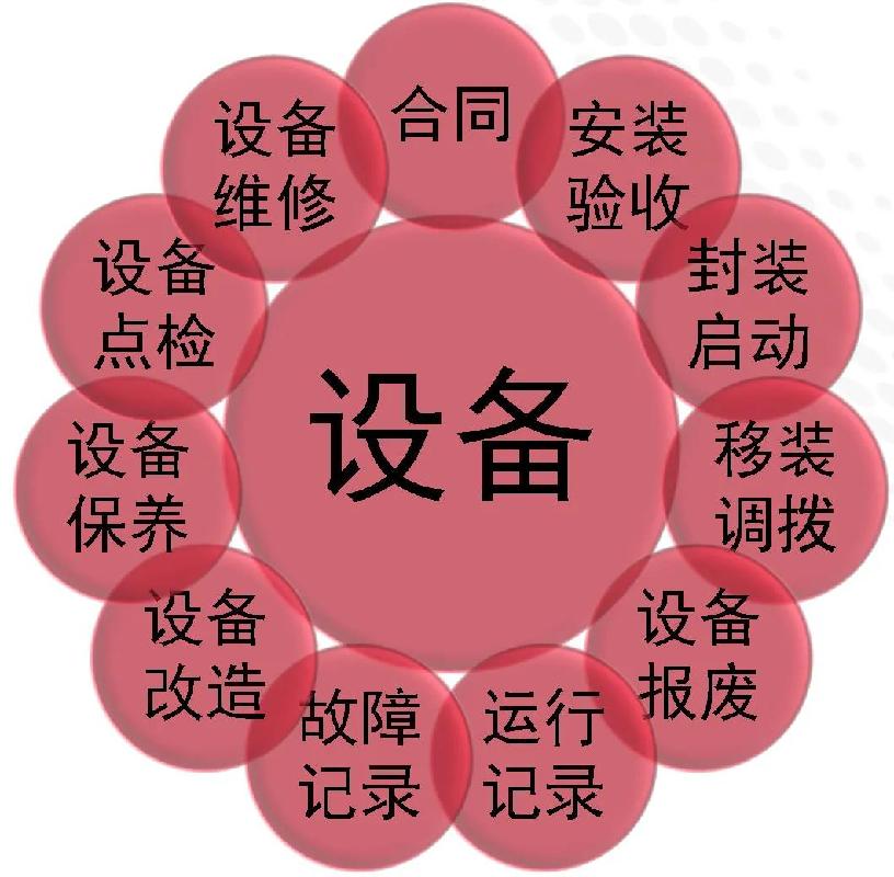 设备管理系统涵盖了设备资产管理(设备台帐、设备改造),设备维护管理(设备预防性管理),设备点巡检管理(包括现场移动作业管理 系统),设备维修管理(设备知识库), 备品备件管理(与 ERP 对接),设备报表等功能模块。
