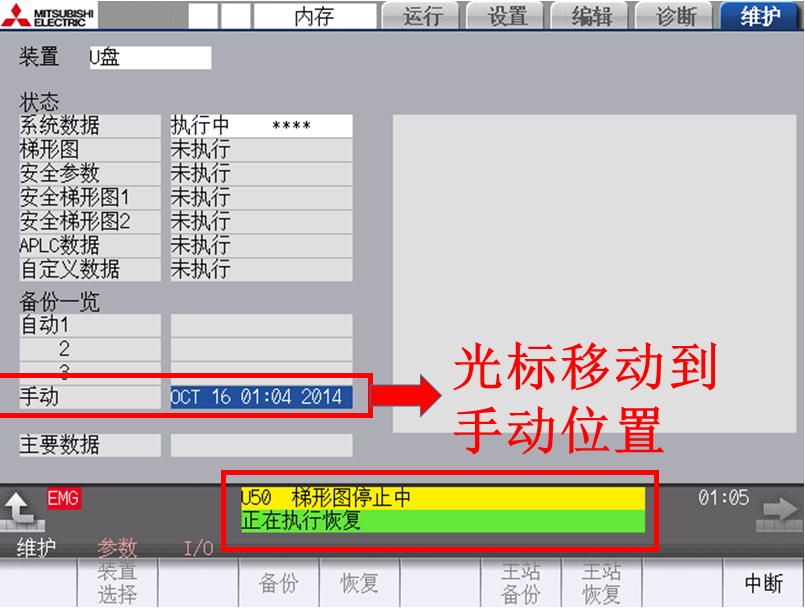 ③将光标移动到“手动”位置(见图14),点击“恢复”,按提示输入“Y”后恢复开始,系统自动提示“正在执行恢复”,当提示“恢复完成”后恢复过程结束,取出SD卡或U盘。
