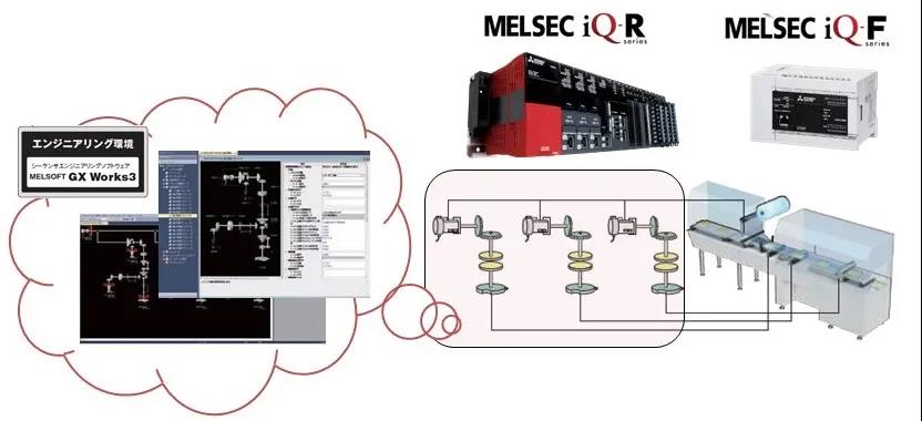 先进同步控制是将齿轮、轴、离合器、减速机、凸轮等机械机构通过软件置换进行同步控制。通过PackingPackage提供的凸轮自动生成FB可简单地实现凸轮生成,还可应对BOX-motion,D-Cam,飞剪等多种主流封包机构。可以基于iQ-R及iQ-F等多种PLC平台实现,保证了高速封包情况下,无堆膜无拉膜效果。