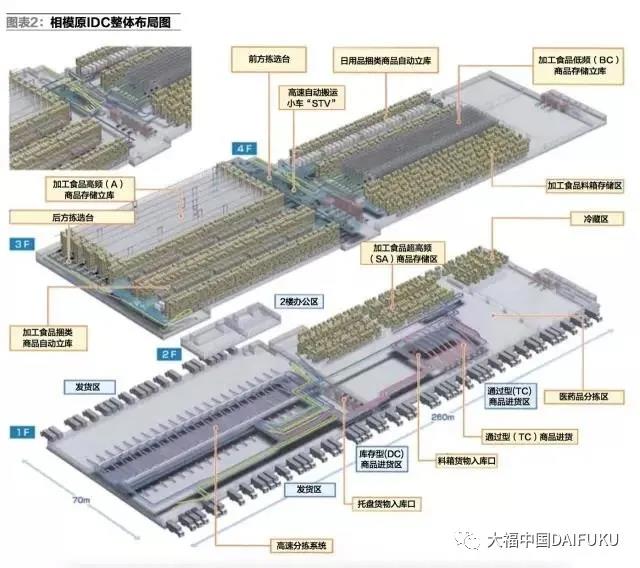 考虑到日本劳动力短缺现象日趋严重,难以招聘到大量员工,而且人工成本较高,于是伊藤忠食品决定大幅提高相模原共配中心的自动化程度,在提升存储、分拣等作业效率的同时,节省人力,降低运营成本。由大福协助完成扩建的综合性统配中心改名为“相模原IDC”,长260米,宽70米,面积扩大了一倍。