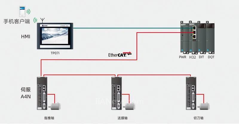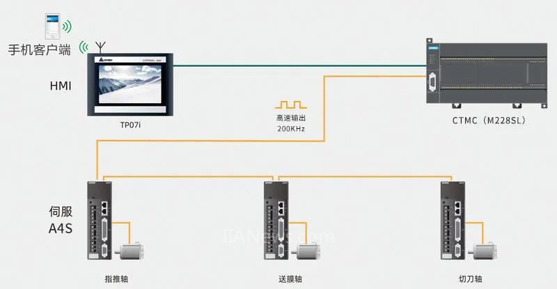 由合信小型运控PLC的CTMC系列追飞剪型CPU与合信旗舰版A4S伺服完成系统的控制,经济实用。