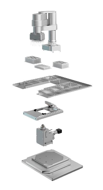 2232…BX4无刷伺服电机与CxD系列内置运动控制器组合,即可满足INCYTOИ ®技术人员提出的这些新要求。除此之外,它们还具备效率高,设计极为紧凑,重量轻,体积小以及适合试验室应用的优点。CYRIS ®FLOX分析设备内一共安装了六台电机。其中三台用于在三个轴向移动机械臂上的吸管头。在它们的控制下,吸管精确运行到微孔板正上方,然后向下运行到位,并释放溶液。第四台电机负责驱动24个吸液活塞,将200 µl培养液输送到无菌吸管内。最后两台电机在位于细胞样本下方的定位滑台上移动显微镜。由于微孔板采用透明材质,可以用显微镜从试验孔下方对样本进行拍照。
