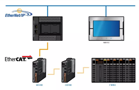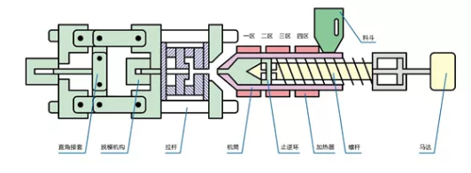 第一部分:储料机构,包括注射伺服、储料伺服,料斗,加热器等。