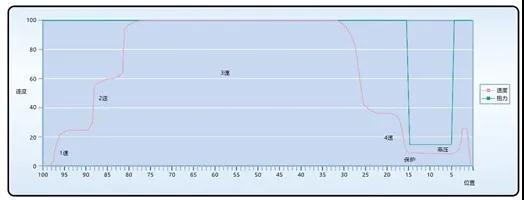 针对注射、储料工艺开发【多段速度控制技术】,快速适应多种设备的开发工作,提高工作效率。针对速度转扭矩造成冲击过大的情况,对切换速度、扭矩进行斜率处理,提高切换过程的平缓性,较少设备冲击。