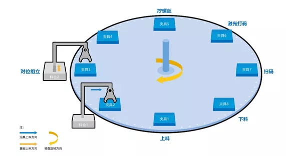 工件从上料工位送至转盘,依次通过对位组立、螺丝紧固、激光打码、自动扫码、下料五个工位循环加工。每个工位在启动之前会判断工位对应的工件有无和工件状态才决定是否启动。