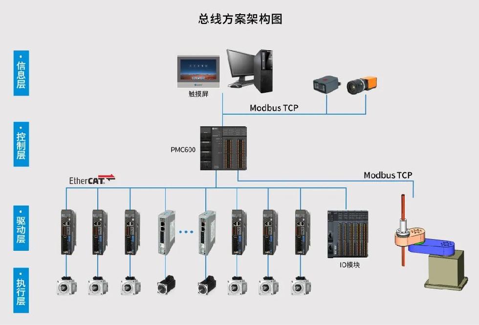 EtherCAT总线PLC整体解决方案,配线方便、电气装配更容易,缩短电气装配调试时间20%以上。