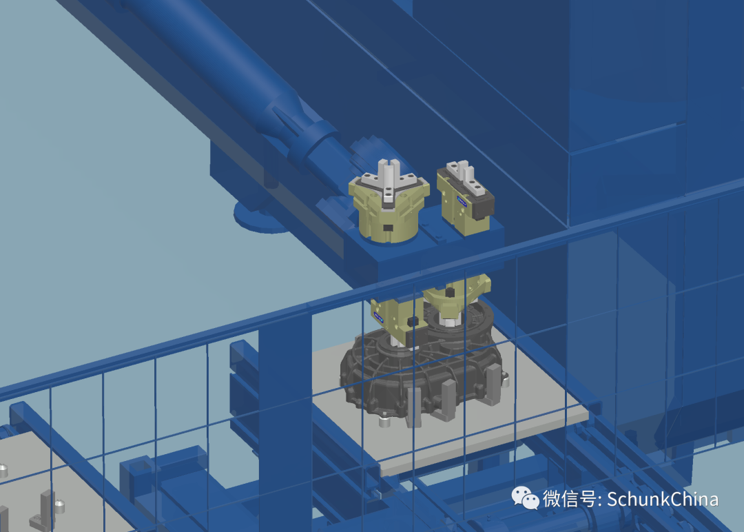 工业机器人末端配备了正反两组机械手,每组均由一个二指机械手PGN-plus-P 125-1-IS-SD和一个三指机械手PZN-plus 125-1-IS-SD构成,两者配合完成工件抓取及搬运。