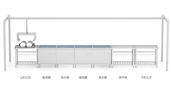 碳化硅晶圆槽式清洗甩干一体机,主要结构包括:上料工位、酸洗槽、清水槽、碱洗槽、缺陷检测工位、甩干机和下料工位。