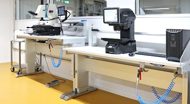 在 MeKo 公司,员工要用高分辨率显微镜对微小零部件进行检测和评估。他们检测的主要是医疗技术零部件,比如支架和心脏瓣膜框架。“我们的测量设备非常敏感,即使是最轻微的振动也会对它造成损坏。这就意味着,工作台必须最大限度地减少振动,并且坚固耐用。”MeKo 公司研发部门的 Tim Igelmann 解释说。由于 MeKo 公司的目标是未来 80% 的工作站都要符合人体工学,因此新工作台的一个基本要求是要有高度调节系统。