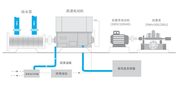 ● 将原电机替换为高速电动机,并与给水泵直连,再通过高压变频调速系统,来负责调节高速电动机的转速,从而大幅提升了电机的整机效率以及整体泵组运行的总效率;