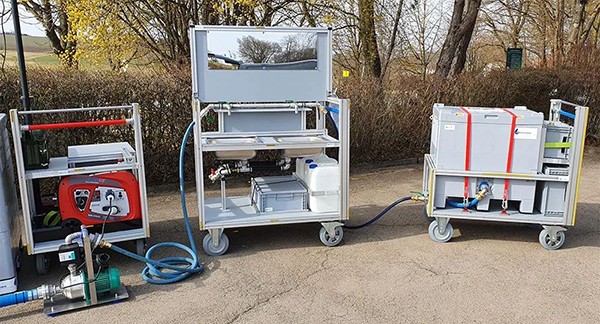 其中一种方法是在直升机上悬挂大型绳网,但是装卸这样的绳网需要耗费很长的时间。为此,德国专业工程和开发公司 LES GmbH, Lenz Entwicklung und Sonderbau 公司创建了一种省时且经济高效的替代方案。他们舍弃了繁琐的大型绳网,转而采用带轮子的外部载荷集装箱和平台。这些小型集装箱可以携带很多设备,比如带吸水管的电动泵、5000 升水箱、消防背包、消防耙和铲子等。上面的轮式小型集装箱只是 LES 公司(总部位于德国恩普芬根)推出的创新型民防解决方案其中的一种,他们在产品中使用了我们的模块化铝型材技术。