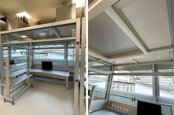 16 个装配单元均采用标准化设计。每个单元配有一个高度可调式工作台、一个带四层搁板的移动式支架和一个采用 item 零部件搭建的移动式侧推车。半封闭式机柜宽约 2.70 米,高约 2.40 米,深约 2.40 米。基本框架由型材 X8 系列和型材 XMS 系列搭建而成,单元中的面板则采用易清洁的玻璃材料。此外,装配单元还采用整合式电缆布线,确保电缆管理的安全性,因为所有的电缆都隐藏在型材框架内部,可避免灰尘污染。“ item 固定系统能牢牢固定面板,特别适合在洁净室中使用,因为它能将基本型材、盖板和密封件完美地连接在一起,从而形成易于清洁的表面 ”。item 瑞士公司销售主管 Michael Hasler 说。除此之外,每个装配单元的天花板中还集成了四个过滤器风扇单元(FFUs)。它们可确保单元内的空气以层流的方式从天花板流向地面,从而防止颗粒在工件或工作表面沉积。因此,每个装配单元都是一个独立的装置——我们可以将它们看成是洁净室中的洁净室。如果有需要,这些单元还可以移动到生产区域的其它位置,从而增加使用的灵活性。