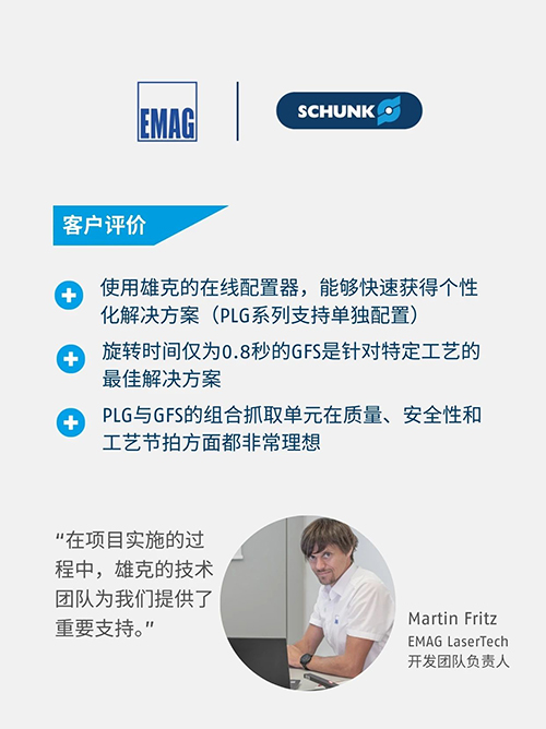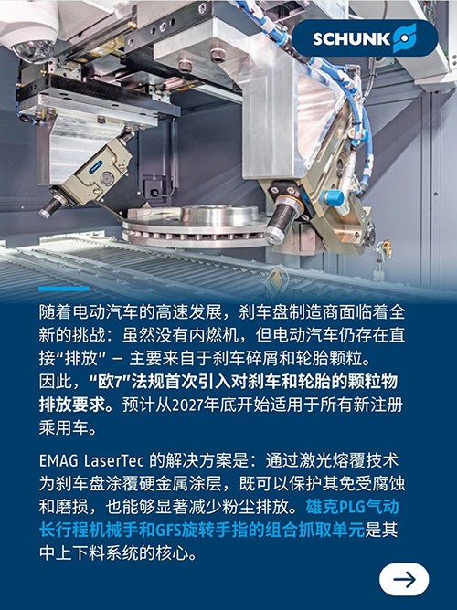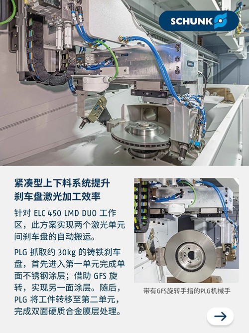 EMAG LaserTec提出了创新的刹车盘生产理念,采用“激光熔覆技术”对刹车盘进行涂层,不仅增强其抗腐蚀和耐磨性能,还能有效减少粉尘排放。其选择了雄克PLG气动长行程机械手与GFS旋转手指的组合抓取单元,服务于ELC 450 LMD DUO工作区内的两个激光处理站。