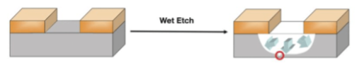湿法蚀刻(Wet Etching)是通过将腐蚀性的液体化学溶液(通常是酸或碱)接触到材料表面来去除材料的一种方法。这种方法适用于不同类型的蚀刻液和工艺参数通常用于不同的材料,包括金属、半导体、绝缘体、光学玻璃和陶瓷等。湿法蚀刻的速度相对较慢,湿法蚀刻在制造微米级和纳米级结构以及微电子器件中具有广泛应用。