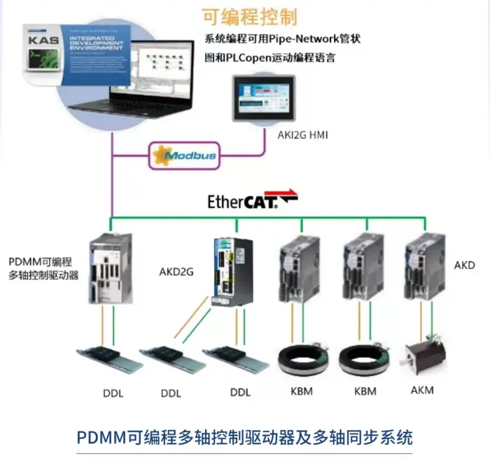 内置AKD驱动器作为主站,可控制7+个从轴驱动器,无需PLC即可构建多轴系统(最大支持128轴),集成完整I/O与人机界面。
