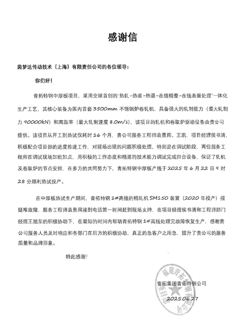 此次青拓特钢3500MM不锈钢中厚板产线的成功热试是茵梦达在高端装备制造与工业服务领域的又一里程碑。未来,茵梦达将继续深耕传动技术创新,以更优质的产品与更高效的服务,为不锈钢加工、高端装备制造等领域的智能化、绿色化发展持续赋能,助力行业迈向新的高度。