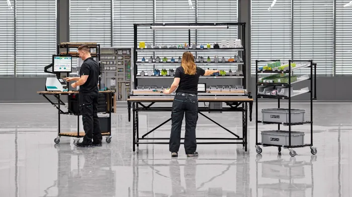 项目推车功能多样,便于生产操作。推车可用于调试和运输。此外,推车可作为组装工作站的临时扩展存储区,从而确保整洁和高效率。项目推车采用模块化设计,可根据特定需要灵活调整。通过人体工学设计和兼容料盒及开放式料仓,推车实现了便捷装卸,应用更广泛。依托导轮和实用把手,满载下的推车仍然可以轻松移动。