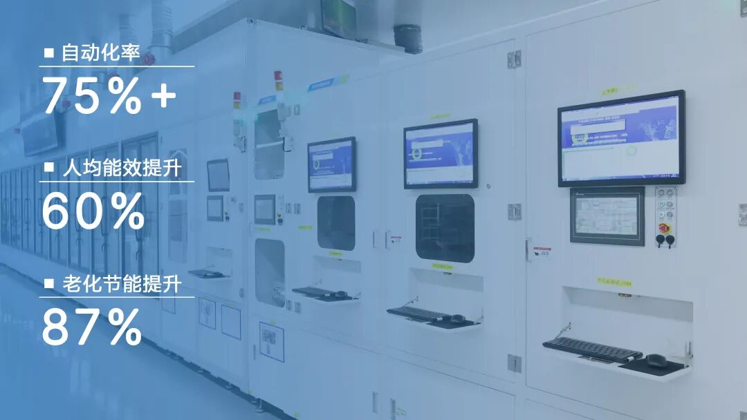 自动化率从成都、东莞工厂的30%飙升至75%以上;人均能效提升60%,员工劳动强度大幅降低;安装能源回收负载柜,老化节能提升87%。