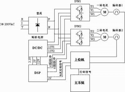系统输入为3Φ 200VAC,经三相全桥整流为约270VDC供给IPM,并由270V进行DC/DC转换产生辅助电源,为DSP、上位机及IPM 模块提供控制电源。上位机接受主系统控制,对DSP发出2路电机起停、4级加速度及8级速度的控制信号,DSP根据上位机的控制信号产生两组6路脉冲分别控制两个IPM模块,从而控制两路电机的起停、加速度及转速。两路电机的转速通过轴编码器反馈回上位机。IPM的故障信号反馈给DSP,DSP将故障信号及掉电信号反馈回上位机。系统框图如图1所示。