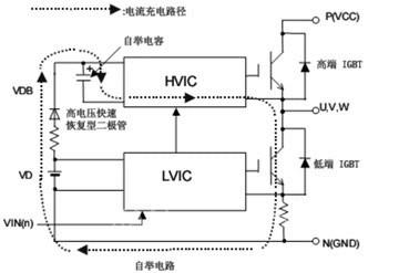 一般逆变电路中,因上臂3个IGBT的触发脉冲的参考地是悬浮的,故上臂触发脉冲需3组相互隔离的电源供电。下臂3个IGBT的触发脉冲是共参考地的,只需一组供电电源。故共需多达4组相互隔离的电源。而三菱公司的DIP-IPM采用自举电路结构,可方便地实现单电源驱动。具体工作原理如下:当 DIP-IPM起动时,先给下臂IGBT发出足够的充电脉冲数或足够宽的单个脉冲,开通下臂(N侧)的IGBT,使下臂的供电电源通过IPM的内部充电路径使上臂的3个自举电容完全充电,从而给上臂的3个IGBT的触发脉冲供电。然后才开始发出PWM控制脉冲。自举电路充电路径及工作时序图如图2所示。