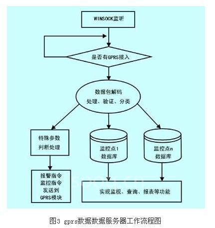 在基于gprs的远程监控系统中,数据服务器端通过基于tcp/ip协议的socket套节字,进行与gprs终端的资料收发,通过开发的在服务器运行的软件对资料进行处理,然后更新到sql数据库中,让合法用户可以在任何时刻、任何地方通过浏览器查看资料。浏览器通过因特网查看远程设备刚刚更新到数据库中的信息,达到现场数据分析、显示等功能。其工作流程如图3所示: