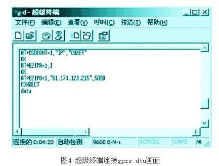 (3)对gprs模块进行设置可以通过第三方软件进行参数配置也可以通过超级终端进行测试,发送at指令at+cgdcont=1,“ip”,“cmnet”,若有数据显示回车后返回ok。说明硬件连接正确。也自编软件进行测试。图4是超级终端连接gprsdtu的画面。