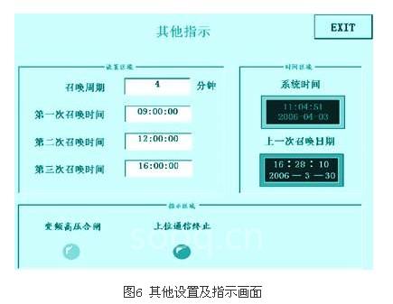 在其他指示界面中有三个区域:在设置区域中,设置每次召唤下位机的召唤周期以及每天三次定时召唤下位机的时间;在时间区域中,显示上位机系统的当前时间和下位机最后一次上传的下位机的运行时间;在指示区域中,显示下位机的变频器的高压合闸状态,及上位机的通信状态,若上位通信终止指示灯亮,表示上位机已经停止对下位机的召唤,下位机不再上传最新数据。
