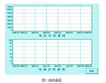 当按下曲线按钮后,进入曲线画面,如图7所示,此时,在该画面显示出电压、电流的实时曲线。按返回按钮,则退出曲线画面。