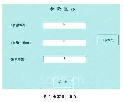 当按下参数查看按钮后,进入参数显示画面,如图8所示,此界面主要用于显示下位机的参数设置情况和频率步距的设置情况。在“p参数编号”输入框中输入要查找的下位机参数号码,则在“p参数当前值”中会显示该参数号所对应的参数值。