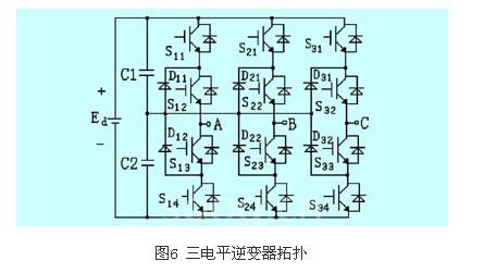 与传统的二电平拓扑结构相比较,中点箝位式三电平逆变器更适合于中高压变频装置高电压、大容量的特点,特殊的拓扑使得器件具有2倍的正向阻断电压能力,其多层阶梯形输出电压,理论上可通过增加级数而使输出电压波形接近正弦,减少谐波,在同样输出性能指标下,三电平的开关频率将是二电平的1/5,从而使系统损耗小。随着电平数增加,每个电平幅值相对降低,dv/dt变小,主电路电流含有的脉动成分减小,转矩脉动和电磁噪声都得到有效的抑制。
