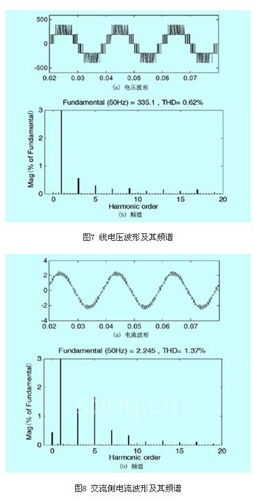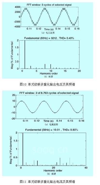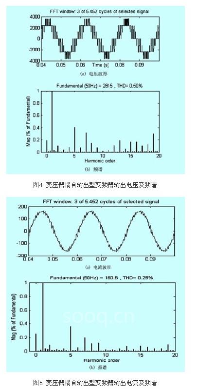 变压器耦合输出型逆变器的输出波形可等效为7电平线电压pwm波,优于普通二电平变频器,dv/dt也较低,只含有非常小的低次谐波,thd值也很低,但高次谐波仍然存在,如23、25次谐波等,这主要是由于每个独立的逆变器采用pwm调制而造成的,采用更好的调制策略或增加一个小容量的低通滤波器可以解决这一问题。
