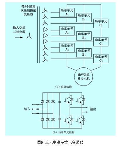 单元级联多重化结构是对多重化技术的推广和应用,是多重化变频器的一种。如图9所示,单元级联多重化变频器采用若干个低压pwm变频功率单元串联的方式实现直接高压输出,电平数的增加有效的抑制了输出谐波。由于每个功率单元模块中除了含有逆变输出结构外,同时含有整流功能,从而相应的实现了整流部分的多重化,使得变频器输入、输出谐波抑制同步完成。其谐波抑制原理与普通多重化相似,也是利用相移技术,使每个功率模块的某些次输出谐波相互错开一定的角度而被消除。
