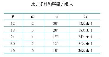 多重移相叠加技术是由k等人早在1962年提出的。该技术采用脉动宽度为60°的6脉动三相全波整流(或等效三相全波整流)作为基本单元,使m组整流电路的交流侧电压依次移相α=60°/m,则可组成脉动数为p=6m的多脉动整流。其脉动数p、组数m、移相角α及对应的谐波次数h之间的关系如表3所示。