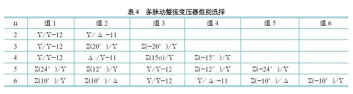 对于18脉动及以上的整流,整流变压器绕组采用曲折接线(z接线)实现,各整流单元并联(或串联),共同向负载供电。只要满足m组6脉动整流交流侧的电压u(n)(n=1,2,……,m)依次移相α=60°/m,即可得到p=6m脉动的多相整流。具体变压器组别选择情况如表4。