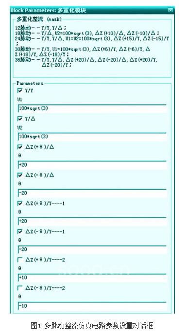 利用matlab中的simulink/powersystem工具箱对多脉动整流仿真研究。本文构建了多重化整流的统一分析模块,设置参数后,使其能够实现12、18、24、30、36脉动整流电路的工作特性。按照参数面板中相关说明,选择合适的变压器接法,并输入相移角度,即可实现相应脉动数的多重化整流仿真分析。多脉动整流输入仿真电路的参数设置面板如图1所示。