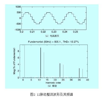 以12脉动的仿真为例,波形及频谱如图2所示,可以看出12脉动时主要谐波为12k±1次,和理论分析相符合。