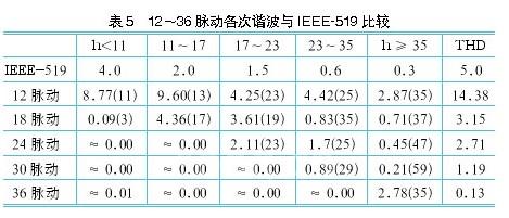 结合ieee-519中的标准,对各脉动数整流进行比较如表5所示,可见,在不增加其他滤波装置的情况下,12脉动整流很能满足ieee-519中的要求,在各个范围内谐波含量均超出标准。36脉动情况要好的多,35次以下谐波及thd都能满足ieee-519的要求,但仍然含有较大的35、37等次的谐波。