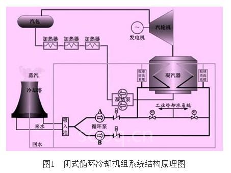 以闭式循环冷却机组为例,循环水系统的主要作用是冷却汽机低压缸排气温度,降低低压缸排气压力,使得主蒸汽在通过汽轮机时最大限度的释放能量做功转化为汽轮机旋转的机械能用于驱动发电机发电。循环水泵的作用是将冷却水压入凝汽器中与作过功的过热蒸汽进行热交换,降低汽轮机末端排压。吸收热量的循环水被输送至冷却塔后喷淋,经逆流自然通风冷却后循环使用。具体的系统结构原理如图1所示。