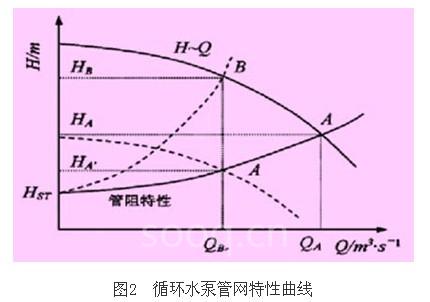 在循环水泵上应用变频调速技术,主要是用于机组在额定负荷以下运行时,循环泵运行参数向下调整的需要。即:运行频率在≤50hz范围内调整。从图2可以看出:只要管网工作压力h高于管网静压值hst,在保证最低流量的情况下即可安全运行。当流量需求降低循环泵转速随之降低,根据流体力学相似定律,压力也会下降。从而,带来冷却水管网及其辅助工业冷却水等子系统的运行变化。