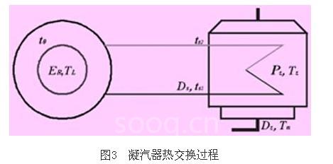 真空度是指凝汽器的真空值与当地大气压的比值的百分数,也就是我们控制循环水系统的直接影响变量,是影响发电机组经济效益的重要参数。由于二次蒸汽在凝汽器中与冷却水进行热交换凝结成水时,由气态转变为液态,体积迅速变化,这就在凝汽器内形成高度真空,同时在汽轮机的排汽口建立并保持高度真空,使进入汽轮机的蒸汽能膨胀到尽可能低的压力,提高了蒸汽对汽轮机的做功能力。即:增大了机组的理想比焓降,提高汽轮机的工作效率。目前,凝汽器真空主要依靠调节冷却水流量来控制。其热交换过程如图3所示。