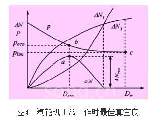 由汽轮机的工作原理可知,运行中的凝汽器压力pz主要取决于汽机负荷dz、冷却水入口温度ts2和冷却水量ds,冷却水温能够降低的最低温度主要取决于自然环境温度t0。在汽机负荷一定的情况下,只有通过增加冷却水的流量来提高凝汽器的真空度,但真空度并不是越高越好,在提高真空度使汽轮机效率(δn1)提高的同时,循环水泵的运行电耗(δn2)也将大幅提高。所以汽轮机正常工作时存在一个与机组负荷对应的最佳运行压力,使δn1与δn2的差值最大,即最佳真空度,如图4所示。