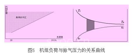 为了保证机组在不同负荷下经济、安全运行,机组在设计和运行中有一条负荷与排气压力的关系曲线。在原有的运行模式下,循环水系统依靠开停方式调节,经济性无法保证,只能通过循环水维持凝汽器真空尽可能低值运行,该曲线主要用于机组保护。在循环水控制应用中,将该曲线作为调节的参考量,进行保守值控制。如图5所示。