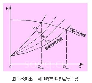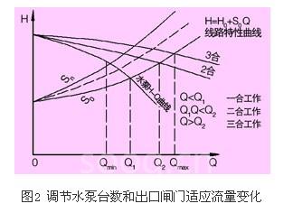 当水泵台数足够多时,是可以很好地适应水量变化的,但是水泵型号是有限的,装机台数过多,不仅管理不便,而且会无谓地增大建筑面积,提高工程造价,即使这样,也无法做到完全适应水量变化,还需要用闸门来调节水量,如图2所示。