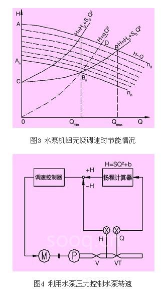 为此,采用水泵机组无级调速技术,可连续地改变水泵转数,来变更水泵工况,使其流量与扬程适应于管网用水量的变化,才能提高机组效率,维持管网压力恒定,达到节能的效果。节能原理如图3所示。ab为全速泵特性曲线,anbn为调速泵特性曲线,cbnb为管路特性曲线,co为几何扬程(含地形差和自由水头),当用水量从qmax减少到qmin的过程中,全速泵的扬程将沿ba曲线上升,而管网所需扬程将沿bbn曲线下降,这两条曲线纵坐标的差值就意味着全速泵扬程的浪费。应用水泵调速技术时,当用水量从qmax变动到qmin的过程中,水泵转数随流量从额定位n降到n1n2n3……nn,水泵的q—h特性曲线ab也相应变化为a1b1,a2b2,a3b3……anbn。而这组平行的特性曲线ab—anbn与管路特性曲线cb的交点轨迹bbn正在管路特性曲线上。这样就可使水泵工作点沿管路特性曲线滑动,使其扬程处处能与系统阻力相适应,做到没有多余压力的损失,且能保持管网压力恒定,根据水泵轴功率的计算公式,收到明显的节能效果。