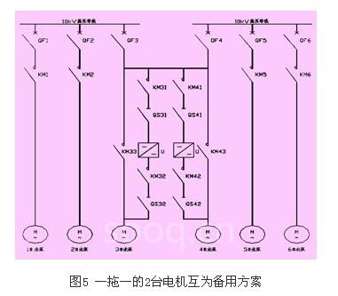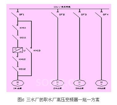 设计院和吉林市自来水集团有限公司通过工艺上认真计算,根据实际工况要求设计主回路电气结构图,选用harsvert-a型高压变频器一拖一的成功方案。如图5所示。一拖一的2台电机互为备用。