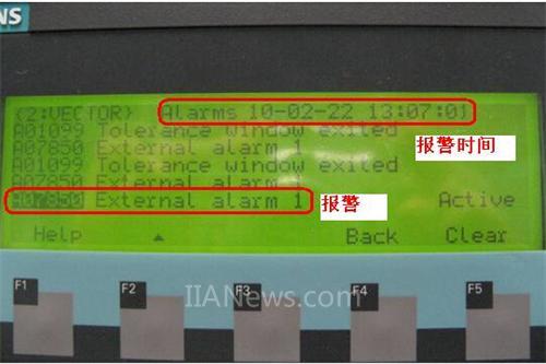 第四步:当G150发生故障或者报警时,打开故障或者报警记录:Main menu\fault memory or Alarm memory\Fault or Alarm\Fault history or Alarm history\Current fault, Current alarm, old fault, old alarm,见图4,报警A07850发生在2010年02月22日13时07分01秒。