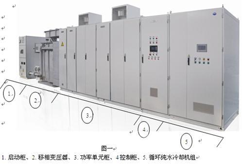 水冷型变频器由启动柜、移相变压器、功率单元柜、控制柜与循环纯水冷却机组组成。与强迫风冷型变频器比较,循环纯水冷却机组为新增加部件,其它部件两者无区别。(见图一)