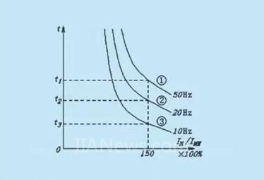 过载保护主要是防止电动机过热,故具有类似于热继电器的“反时限”特点。就是说,如果与额定电流相比,超过得不多,则允许运行的时间可以长一些,但如果超过得较多的话,允许运行的时间将缩短,如图1所示。此外,由于在频率下降时,电动机的散热状况变差。所以,在同样过载50%的情况下,频率越低则允许运行的时间越短。