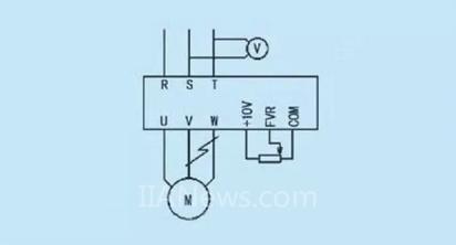 首先要判断是否短路。为了便于判断,在复位后再起动前,应在输入侧接入一个电压表,如图2所示。重新启动时,电位器从零开始缓慢旋动,同时,注意观察电压表。如果变频器的输出频率刚上升就立即跳闸,且电压表的指针有瞬间回“0”的迹象,则说明变频器的输出端已经短路或接地。